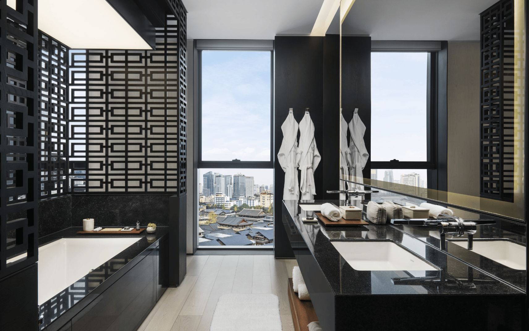 Expansive suite with contemporary Chinese design, private balcony and spa-inspired bathroom.