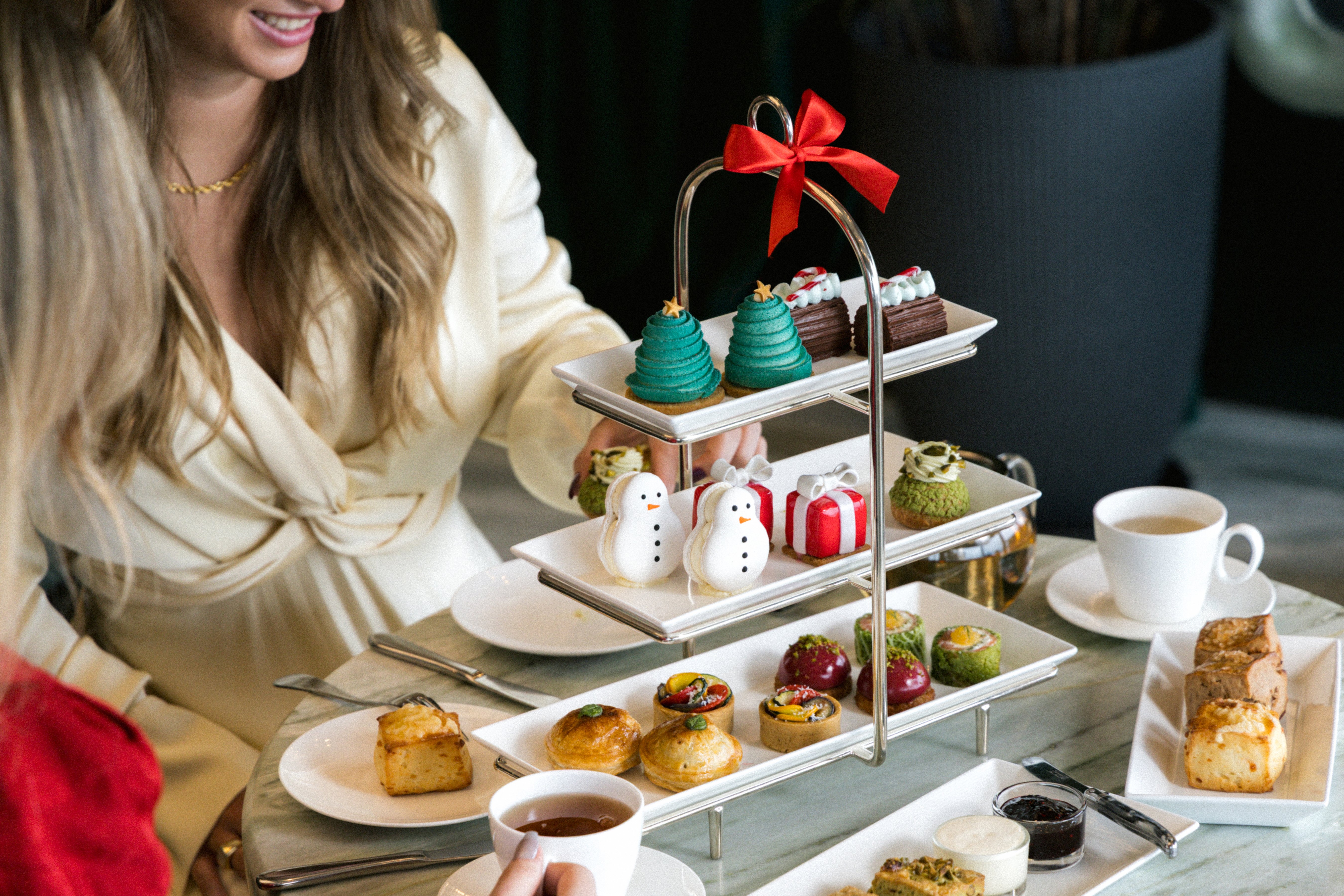 Crafted to enhance the holiday spirit. Festive savoury and sweet bites feature duck rillette with raspberry and pistachio, spiced apple scone, chocolate and mint Yule log, chestnut and cherry Mont Blanc.